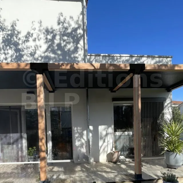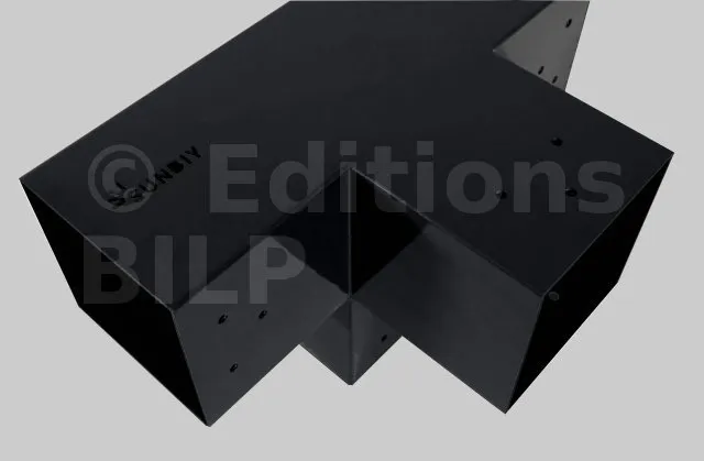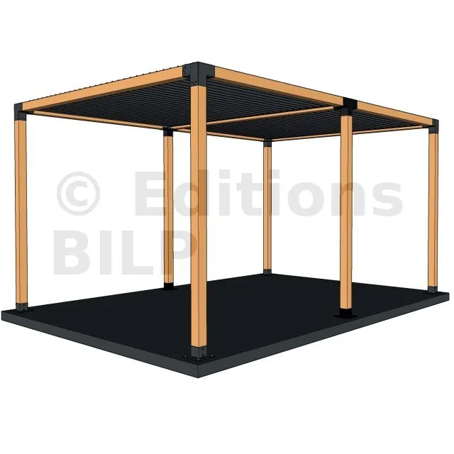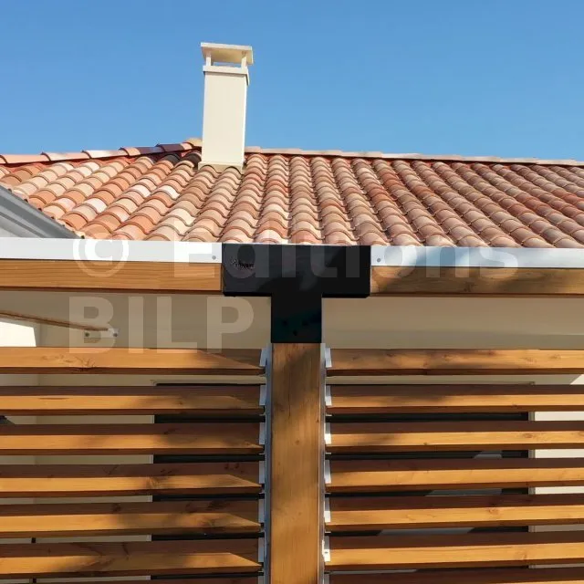 Il permet de raccorder une poutre de 90x90mm perpendiculairement à un chevron de 90x90mm, le tout étant supporté par un poteau vertical de 90x90mm.