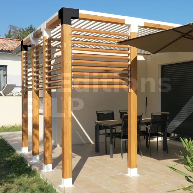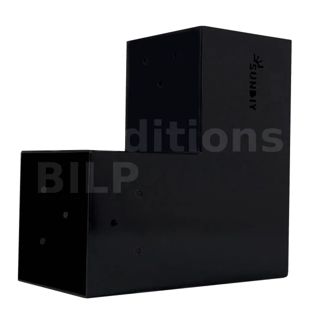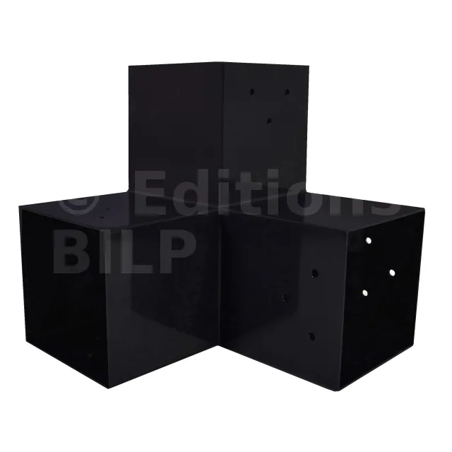 Il est utilisé dans un angle extérieur. Ce connecteur va permettre de raccorder une grosse poutre 120x120mm perpendiculairement à une poutre 120x120mm, le tout étant supporté par un poteau vertical 120x120mm.