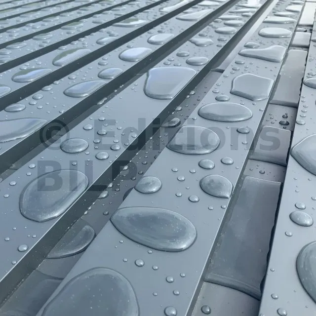 L’eau est collectée dans la rigole intégrée à la lame. Sous l’effet de la gravité, elle s’écoule ensuite de part et d’autre à chaque extrémité de la lame. Si vous recherchez une étanchéité totale, nous vous conseillons d’ajouter des chenaux qui viendront récupérer l’eau à chaque extrémité et la rediriger vers l’extérieur.