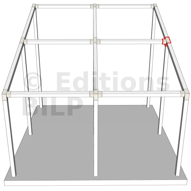 Connecteur d’angle intérieur à quatre directions, conçu pour l’assemblage de deux poutres en section 120x120 mm formant un angle de 20° avec un poteau vertical de même section. Il assure une liaison structurelle rigide et orthogonale à mi-hauteur, garantissant la stabilité de l’ensemble.