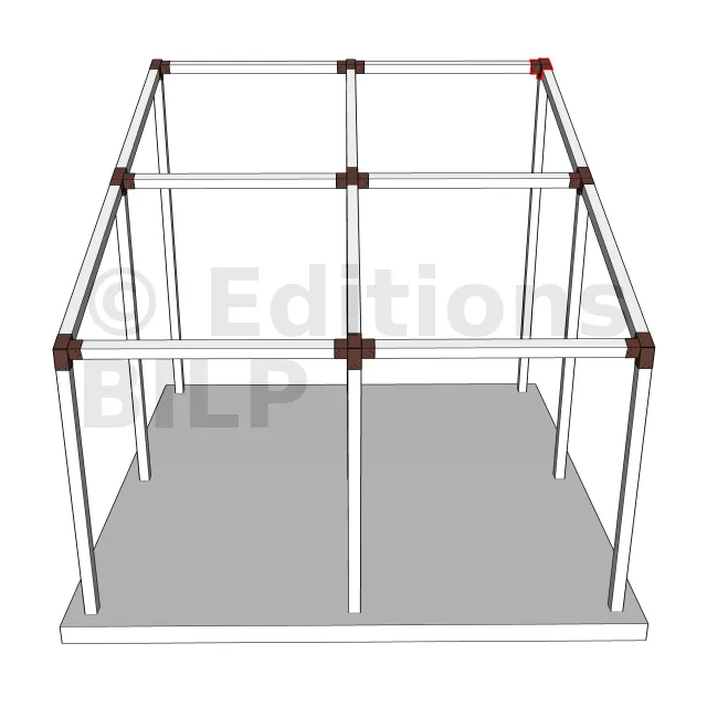 Il est utilisé dans un angle extérieur. Ce connecteur va permettre de raccorder une poutre 120x120mm à une poutre 120x120mm avec une pente de 20°, le tout étant supporté par un poteau vertical 120x120mm.