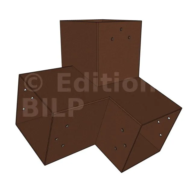 Il est utilisé dans un angle extérieur. Ce connecteur va permettre de raccorder une poutre 120x120mm à une poutre 120x120mm avec une pente de 20°, le tout étant supporté par un poteau vertical 120x120mm.