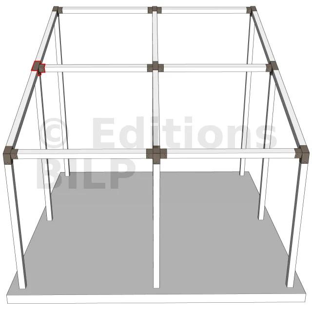 Connecteur d’angle intérieur à quatre directions, conçu pour l’assemblage de deux poutres en section 120x120 mm formant un angle de 20° avec un poteau vertical de même section. Il assure une liaison structurelle rigide et orthogonale à mi-hauteur, garantissant la stabilité de l’ensemble.