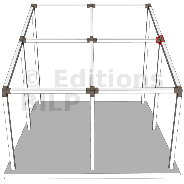 Connecteur d’angle intérieur à quatre directions, conçu pour l’assemblage de deux poutres en section 120x120 mm formant un angle de 20° avec un poteau vertical de même section. Il assure une liaison structurelle rigide et orthogonale à mi-hauteur, garantissant la stabilité de l’ensemble.