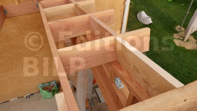 La structure des débords de toit est formée par des aboutages ayant la même section que les chevrons, et des closoirs qui maintiennent et ferment les espaces entre les aboutages. Ces aboutages sont fixés contre les chevrons de rive et prennent appui sur l’ossature des murs pour éviter qu’ils soient complètement en porte-à-faux.