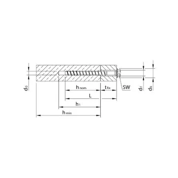 | Références | Profondeur minimale de perçage [mm] | Diamètre de perçage de la pièce à fixer (df) (au travers) [mm] | Ouverture de clé sur plat | Couple de serrage [Nm] | Profondeur d’ancrage (hnom) [mm] | Distance au bord minimale (Cmin) [mm] | Epaisseur minimale du support (hmin) [mm] |