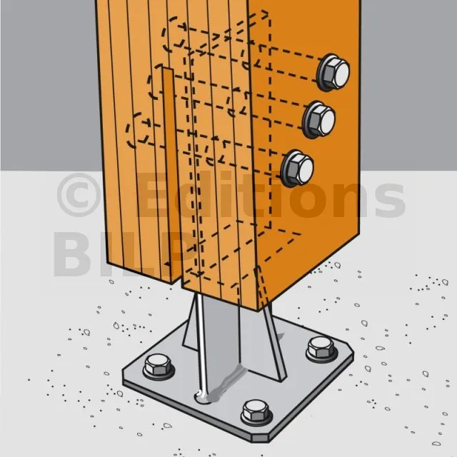 - Connexion bois sur support rigideSur poteau : 2 STD12 ; sur béton : 4Ø12 (goujons WA M12 ; tige filetée M12) ; sur acier : boulons