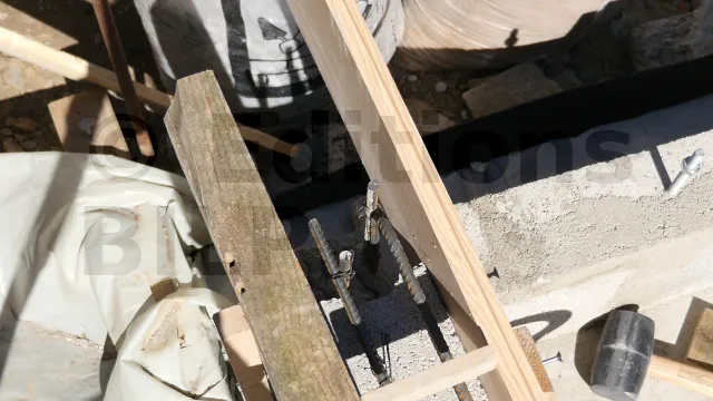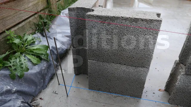 - Mettez en place des piquets en bout de fer à béton sur l’alignement des cordeaux à une distance d’une vingtaine de centimètres des extrémités de l’extension.