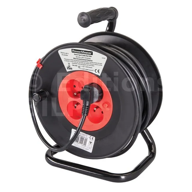 Protection anti-surcharge et bouton de réinitialisation. Facile à dérouler grâce à sa poignée. Base stable et robuste. Comprend 4 prises européennes de type E (CEE 7/5) et prise Schuko (CEE 7/7). Intensité maximale de 16 A. Pour brancher des appareils jusqu’à une puissance cumulée de 3 000 W (toujours dérouler complètement le câble lorsque la puissance dépasse 1100 W). Pour les pays utilisant des prises de type E (par exemple la France, la Belgique, la Pologne, la République tchèque et la Slovaquie). Câble de 25 m de long, section de conducteur 3G 1,5 mm².