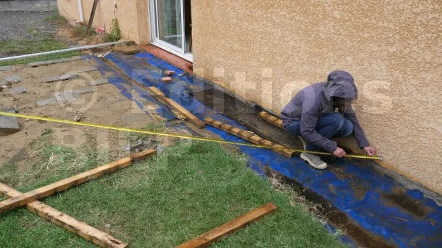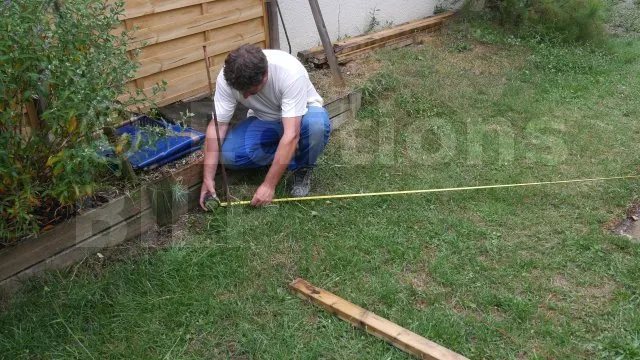 La règle qui a été utilisée pour la méthode 3/4/5 ne doit être déplacée qu’après la mise en place des piquets. Vous devez tirer un cordeau suivant l’alignement de la règle, ensuite, il faut l’attacher à un clou à l’extrémité du chantier et enfin, mesurer la largeur de l’extension et placer un piquet.