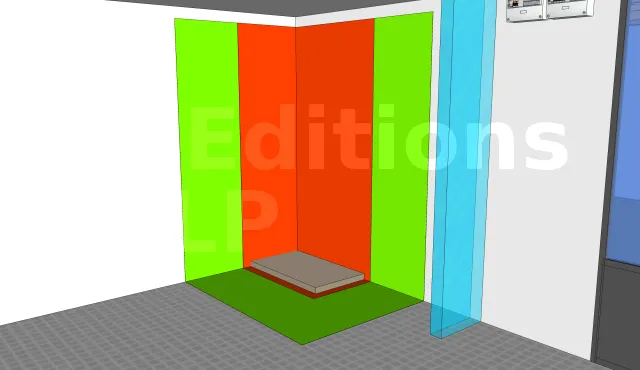 Verticalement : à 2,25 m au-dessus du sol, du fond de la baignoire ou du receveur de douche. - Volume 2 : Le volume 2 est le volume situé à 0,6 m au bord du volume 1. (Couleur verte sur les images)