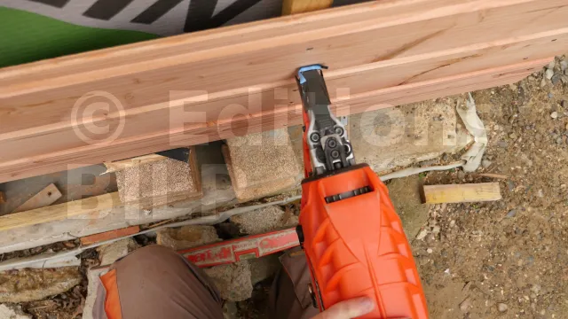 1. Découpe de la pièce de bois à l‘angle désiré, puis mise en place à l‘aide d‘une équerre.
