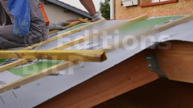 Les contre-lattes sur chaque pente ne doivent pas dépasser sur la pente opposée pour faciliter la pose de la lisse de rehausse. Pour cela, tirez un cordeau aux extrémités de la faîtière afin d’obtenir un alignement parfait. Enfin, coupez les contre-lattes pour les ajuster.