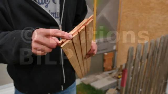 Les lames sont dotées de rainures et de languettes sur leur longueur et leur largeur. La rainure sur la largeur se trouve à droite de la planche, ce qui signifie que la pose doit commencer par le bas et à droite, avec la rainure orientée vers le mur du bâtiment.