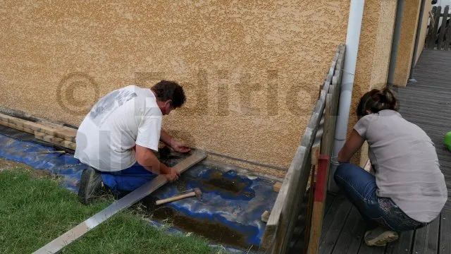 La planche est fixée aux tasseaux. La base de la planche s’aligne avec le repère précédemment tracé. Il est important de bien régler l’horizontalité des planches de la première ligne car l’alignement des lignes suivantes en dépend.