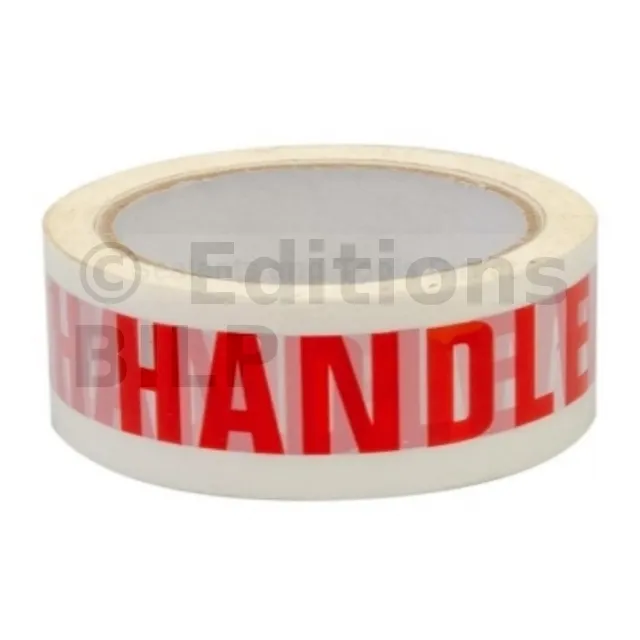 Lettres rouges sur fond blanc indiquant la mention en anglais HANDLE WITH CARE