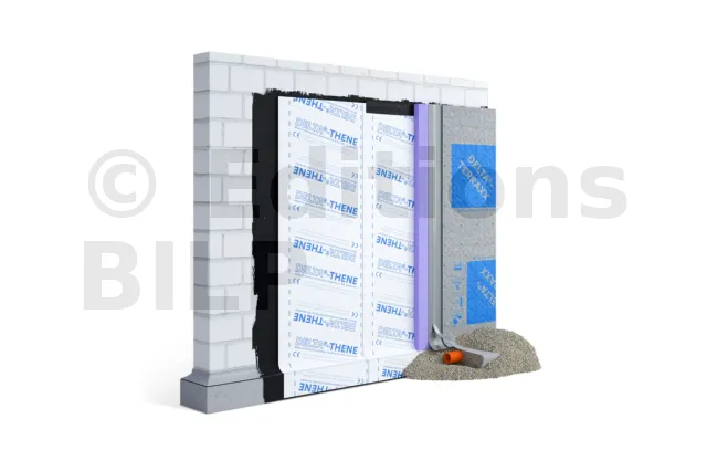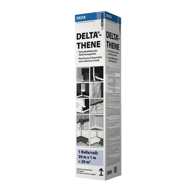 - DELTA®-THENE est un produit d’étanchéité rapide et facile à poser. Il est appliqué sur une paroi préalablement traitée avec le primaire d’accrochage PRIMER DELTA®-THENE. Sa structure quadrillée de 10 cm permet une découpe facile et précise des bandes à l’aide d’un cutter. Il est adapté à toutes les tranchées, même les plus étroites, et offre une étanchéité durable et fiable.