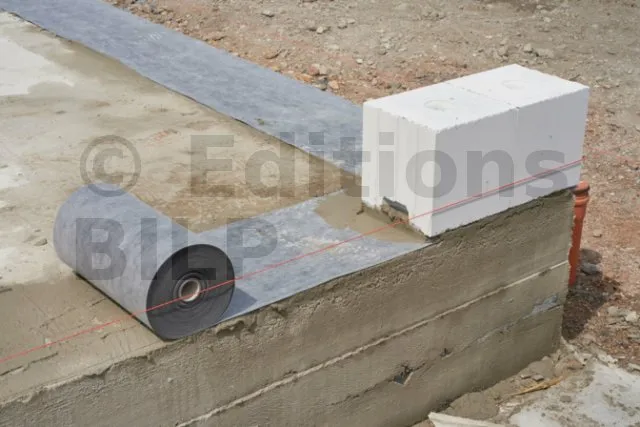 - Ouvrages en maçonnerie (DTU 20.1) : La bande DELTA®-PROTEKT est placée entre deux couches de mortier de ciment, à une hauteur d’au moins 15 cm au-dessus du niveau final du sol extérieur.