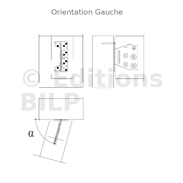| Largeur | Hauteur | Largeur poteau | A | B | C | t | α [°] | Ø5 | Ø8,5 | Ø12,5 | ||||||