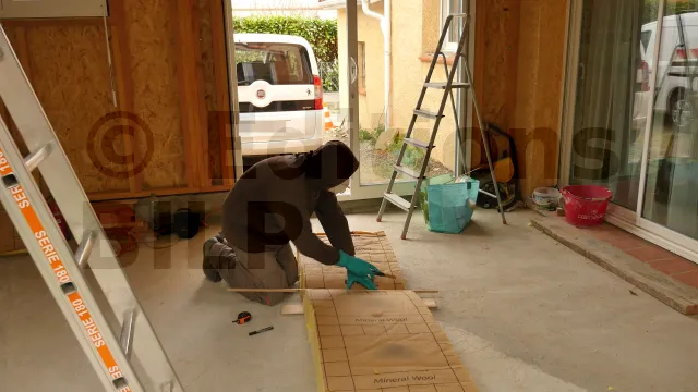 Les lattes ont une longueur plus courte que l’extension et les espacements entre les contre-lattes sont différents, ce qui nécessite des coupes pour aligner les extrémités des lattes d’une même rangée avec les axes des contre-lattes correspondantes.