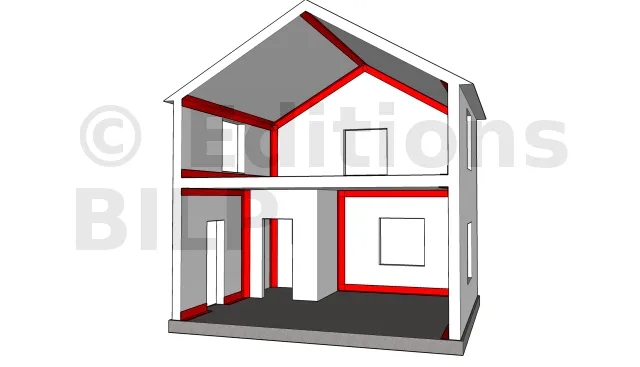 Les ponts thermiques se situent généralement au niveau des jonctions entre deux surfaces formant un angle (coins) dont l’une au moins se situe du côté extérieur de la maison :