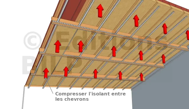 - Compresser légèrement l’isolant entre les chevrons. Ainsi, il reprendra sa forme initiale en maintenant un contact parfait avec la structure.