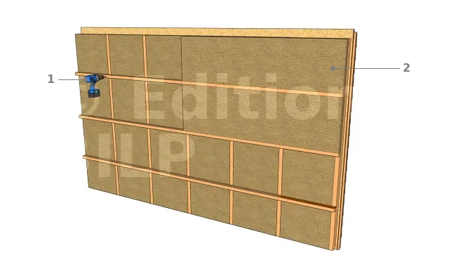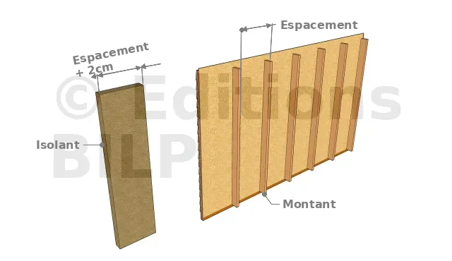 - Visser des tasseaux horizontaux (hauteur égale à l’épaisseur de l’isolant secondaire, espacement égal à la largeur de l’isolant - 2 cm) contre les montants verticaux ;