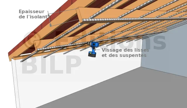 - Visser les suspentes sur les chevrons en vous aidant d’un cordeau pour assurer leur alignement ;
