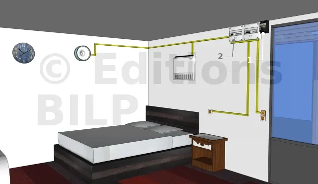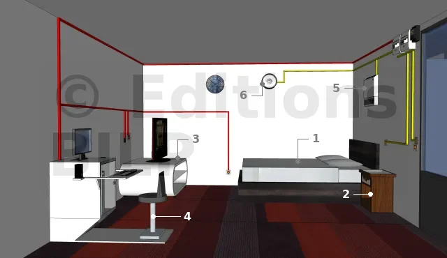 Ce sont les appareils électriques, les outils de commande, les prises électriques et les prises de communication qui occupent la pièce.