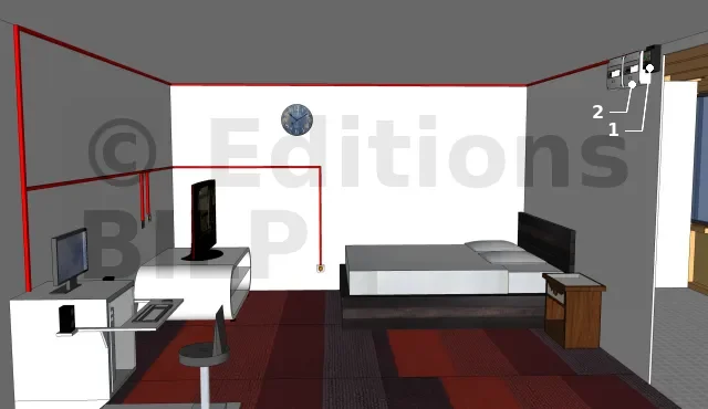 - Un point d’éclairage situé sur le plafond commandé par un interrupteur de commande placé à l’entrée ;