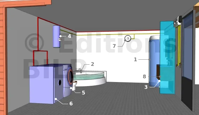 - 8 : Mur séparant la salle de bain et la salle avoisinante. Il est annoté que les tableaux électriques ne doivent jamais se trouver dans une salle de bain.