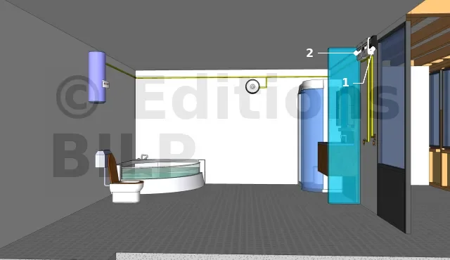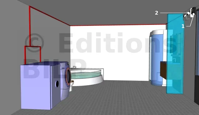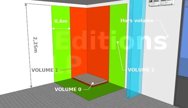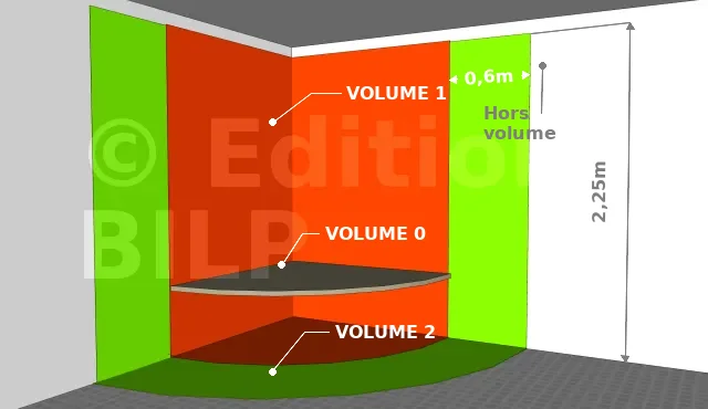 Verticalement : à 2,25 m au-dessus du sol, du fond de la baignoire ou du receveur de douche. - Volume 2 : Le volume 2 est le volume situé à 0,6 m au bord du volume 1. (Couleur verte sur les images)