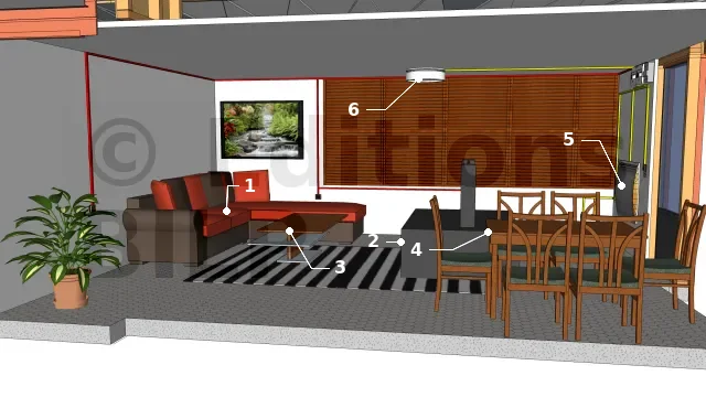 - Prise de courant : La pièce est équipée de 6 prises de courant et de 2 prises TV. C’est le nombre minimum exigé par la NF C 15-100 pour un séjour inférieur à 28 m².