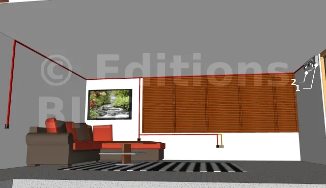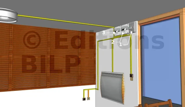 - Un point d’éclairage situé sur le plafond commandé par un interrupteur de commande placé à l’entrée