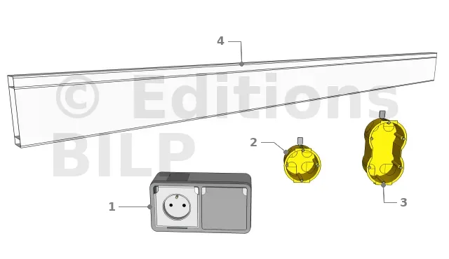 - 3 : Boîte d’encastrement 2 postes (un dispositif de connexion de luminaire DCL), utilisation horizontale ou verticale possible. Ces boîtes d’encastrement ont pour rôle d’éviter les chocs électriques pendant l’action de remplacement des appareils électriques comme l’ampoule.