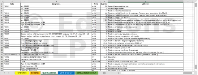 Généralement, les professionnels de la construction ou les auto-constructeurs utilisent un tableur sous Open office ou Excel pour établir le devis estimatif d’un ouvrage. On y rencontre le métré, le sous-détail de prix de chaque composant et le prix total estimatif de l’ouvrage. En même temps, on peut sortir la liste d’achat.