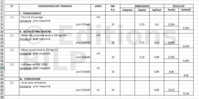 Pour une facilitation de traitement et de lecture de la feuille, une liste de sous-ouvrages est disposée : terrassement, béton et maçonnerie, ferronnerie.