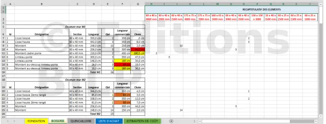 Les colonnes à partir de H relèvent les quantités à commander selon la section et la longueur commerciale. Il faut bien être assidu pour ne pas se tromper lors du report des quantités des pièces récupérées par les chutes ainsi que les pièces assurées par une seule longueur commerciale. Exemple : deux pièces de 200 cm de long peuvent être assurées par une seule pièce de 400 cm de long. La quantité à commander reste donc une pièce de 400 cm de long.