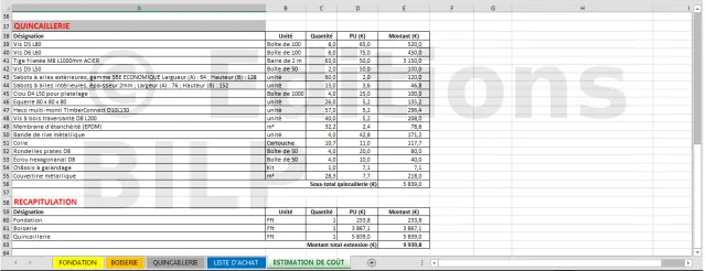L’outil de BILP pour l’estimation du coût des ouvrages à ossatures bois utilise l’outil tableur prenant un à un chaque sous-ouvrage. Il part du métré, ensuite passe par le calcul de récupération des chutes pour enfin sortir la liste d’achat finale du bois. Les infrastructures et les quincailleries sont calculées à part entière.