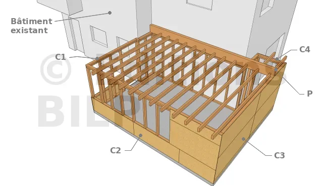 - Aucune fixation des panneaux de murs de l’extension n’est ancrée dans les murs du bâtiment existant.