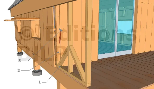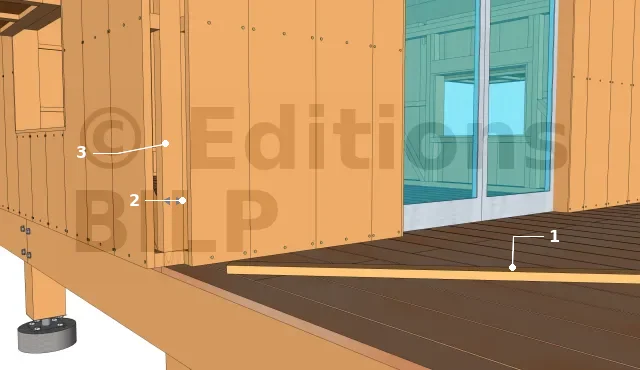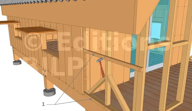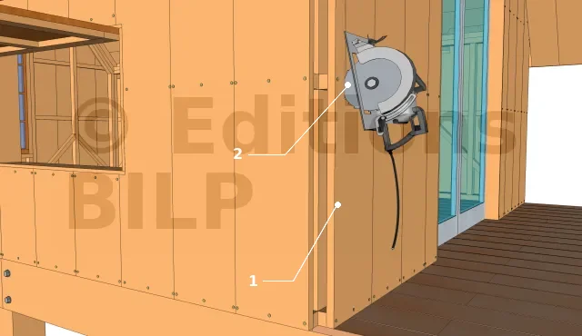 Enlever cette partie découpée du bardage ainsi que tout autre élément pouvant gêner l’emplacement de la nouvelle ossature tel que les fixations (vis, clou, etc.), les tasseaux de bardage, le contreventement en OSB, etc. Le seul élément qui doit rester visible est l’ossature contre laquelle sera accolée la nouvelle ossature de l’extension.