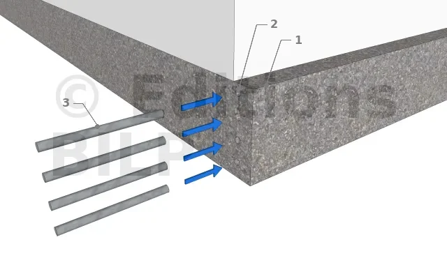 Pour les fixer dans la dalle, on utilise de la colle époxy et l’autre extrémité libre sera reliée avec les armatures de la nouvelle dalle (qui sera coulée par la suite) en pleine longueur, s’il y en a.