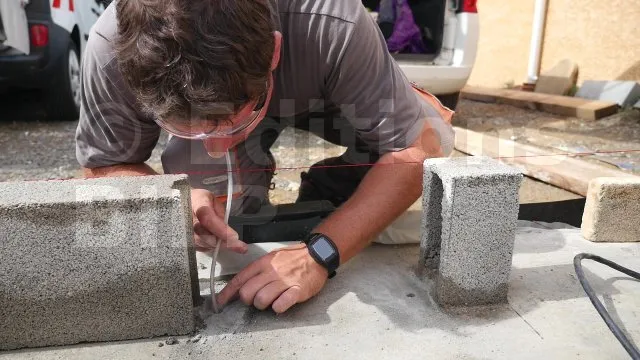 - Il faut trois personnes pour la manipulation, deux personnes doivent tenir le matériel sur les deux extrémités et la troisième personne se place au milieu et doit tirer le cordeau vers le haut puis le relâcher pour le traçage.