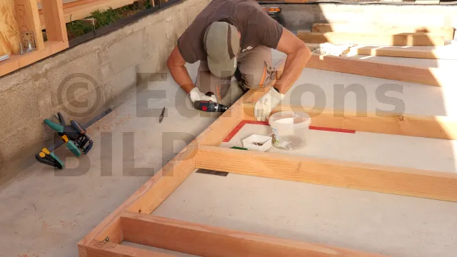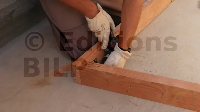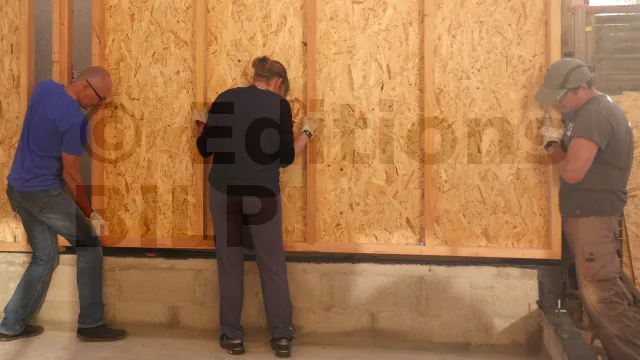 Après avoir démonté le premier montant et la lisse basse de leur emplacement, les autres éléments du panneau sont assemblés en suivant les même opérations décrites dans l’article Montage du demi-mur M1.