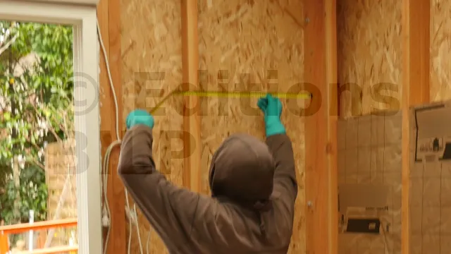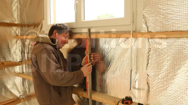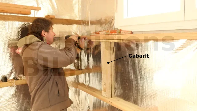 Vérifiez la verticalité pour éviter les mauvaises surprises lors de la pose du revêtement intérieur. Ajoutez des cales plastiques entre les lattes et les montants pour ajuster.