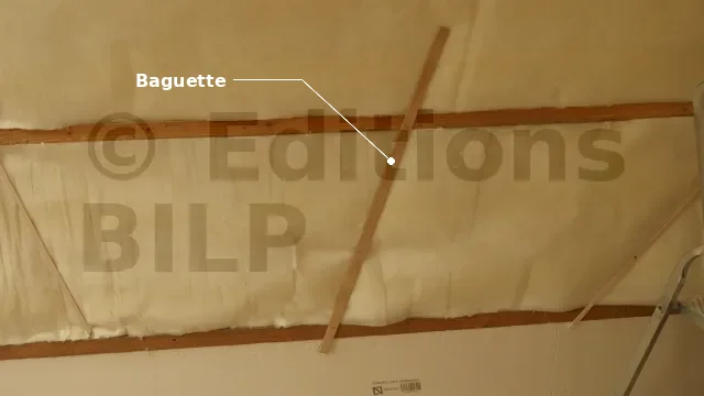 Les laines de coton sont maintenues entre les lattes avec des petites baguettes en bois jusqu’à ce que les lambris soient posés. Ces baguettes doivent être fixées aux lattes avec des clous.