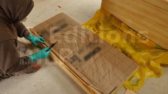 Pour réaliser les coupes, placez un morceau de planche sous l’isolant afin d’éviter de casser la lame du cutter et d’obtenir une coupe plus nette. Placez ensuite une latte sur la ligne de coupe et exercez une légère pression avant de couper avec le cutter.