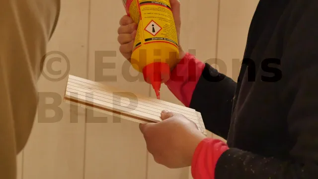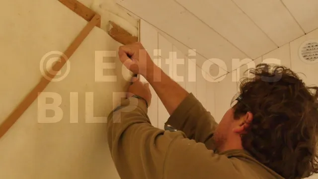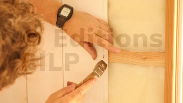 Pour cette deuxième méthode, ce sont les languettes qui sont visibles dans le sens de la pose. Après avoir vérifié la verticalité, fixez le premier lambris avec des clous tête homme au niveau des tasseaux sur la languette de la lame. Pour obtenir une finition parfaite, n’oubliez pas de calfeutrer les clous en utilisant un chasse-clou.