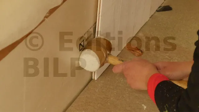 Pour mettre en place le premier lambris, commencez par couper la languette de la lame. Placez ensuite cette partie coupée contre le mur adjacent, de manière à ce que la rainure soit visible dans le sens de l’avancement de la pose. Prévoyez un espace d’au moins quatre millimètres entre le sol et les lames pour permettre leur dilatation ou leur retrait. Pour cela, nous vous recommandons d’utiliser des cales plastique. Enfin, Vérifiez l’aplomb du lambris pour obtenir des jointures bien verticales et une finition impeccable avant de la fixer sur les tasseaux à l’aide de crochets pour lambris et de clous.