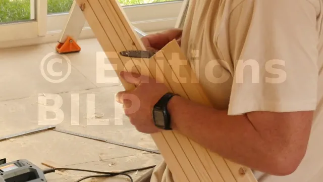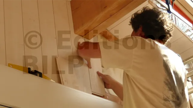 - Pour obtenir la hauteur de l’encoche, placez un morceau de lambris coupé avec la même pente que le plafond. Ensuite, marquez la hauteur de l’encoche, c’est-à-dire la hauteur de la surface en contact avec les pannes.
